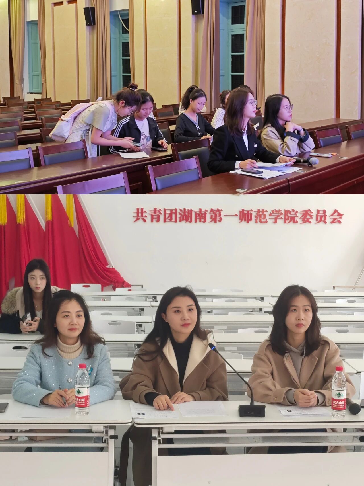 近日,“第一师范”红色戏剧社招募面试工作圆满结束。本次招募分别在东方红校区与城南书院校区同步开展,吸引了大量对红色文化充满热情、怀揣着戏剧梦想的学子积极参与。面试现场人头攒动,气氛异常热烈。来自毛泽东与第一师范纪念馆宣教科的邹磊、熊灿星两位老师,以及团委的华娟老师,共同担任面试官。他们以专业的眼光,为选拔出优秀的人才提供把关保障。