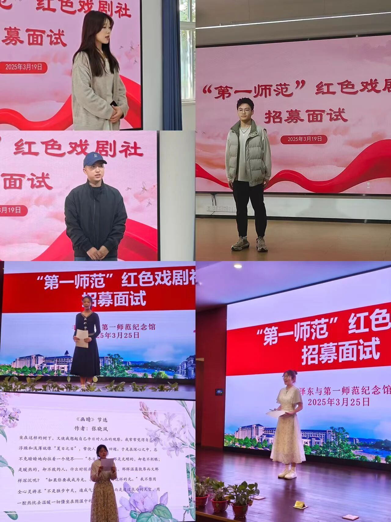纪念馆邹磊、熊灿星老师拥有丰富的红色文化知识与宣传经验。面试时,他们从专业角度出发,对两个校区的同学在角色塑造、历史背景还原等方面提出指导意见,期望入选同学能精准演绎出红色故事的精神内核。团委华娟老师着眼于校园文化建设,重视面试同学的综合能力,期望红色戏剧社能成为校园文化的重要推手,为学子们搭建一个展现自我的舞台。经过层层严格筛选,最终58名佼佼者脱颖而出,荣幸加入红色戏剧社。