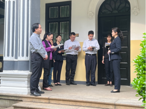 全体老师从大礼堂出发,沿旧址沿线,再到每个陈列展厅,逐一学习每个旧址文物和展陈内容,张颖副馆长详细地讲授了讲解礼仪、语言组织和引导技巧,她分享了讲解前期准备的经验,提出要做到讲解时目中有人,练习时目中有物;颜蒹葭老师为大家拓展了文物及展陈内容背后的文史知识,建议大家要多阅读相关书籍、主动开展研究。在学习过程中,大家频繁互动,就年代、人物、背景等细节问题开展了激烈的讨论。老师们纷纷表示,这次学习研讨活动开展得扎实有效,收获颇丰。杨丹副馆长提出,以后全员学习研讨活动要成为常态,长期保持良好的学习氛围,形成优良的学习传统,使大家在学习中共同进步,在研讨中共同成长。