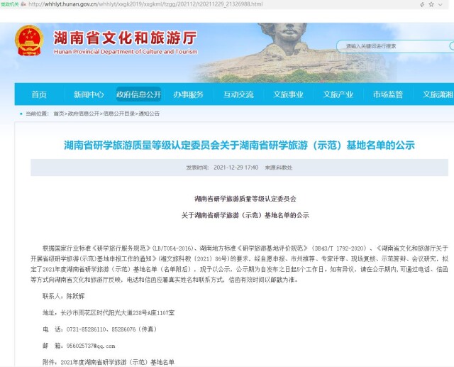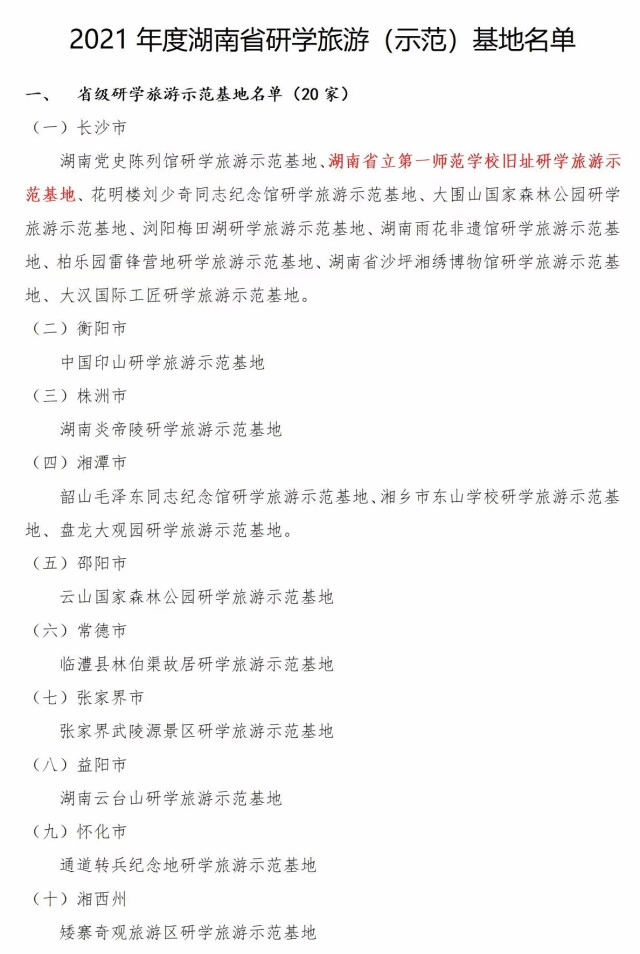 湖南日报·新湖南客户端1月14日讯(通讯员 颜蒹葭)近日,湖南省研学旅游质量等级认定委员会发布了《关于湖南省研学旅游(示范)基地名单的公示》。湖南省立第一师范学校旧址顺利通过了公示,成为全省首批20家省级研学旅游示范基地之一。湖南省立第一师范学校旧址在初审(书面申报材料审核)中排名第一,在终审(示范答辩)后的公示结果中排在第二,受到湖南省文化和旅游厅的充分肯定。