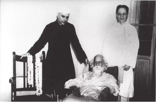 1937年谭云山与泰戈尔、尼赫鲁合影(上左图) 谭云山创建的中国学院外景(上右图)