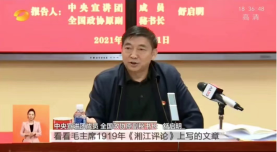 我校多名师生代表发言及提问。我馆副馆长杨丹提问:“湖南一师是主席母校,一代伟人毛泽东在此求学、工作八年之久,并在此从事中国共产党的创建等一系列革命活动,是中国共产党人初心的萌发地。对于新时代我校如何赓续红色基因,传承红色文化,走好新的赶考路,您有何指导性意见?”舒启明答道:“湖南一师红色资源丰富,你们应该挖掘、挖掘、再挖掘,把红色资源变成教育资源,使其进入到教材、课堂,进入到学生的灵魂和血液中,落实在行动上。学校应在红色一师上做文章,在红色一师上下功夫,在用习近平新时代中国特色社会主义思想教育新人上做出实实在在的事。”马克思主义学院学生蒋京素问道:“作为新时代的青年大学生,我们应当怎样从党的百年奋斗的重大成就和历史进程中汲取养分,书写出属于新时代青年的风采华章?”舒启明答道:“毛主席1919年《湘江评论》发文呼吁:天下者我们的天下,国家者我们的国家,社会者我们的社会,我们不说谁说,我们不干谁干。我们一师的学生们,乃至我们这一代青年大学生,就应该赓续红色血脉,发扬革命传统,争取更大的光荣。因此,要上得了共和国建设的脚手架,守得住广袤国土的边疆,服务得住最广大的人民群众,让青春绽放出美丽的光彩。”