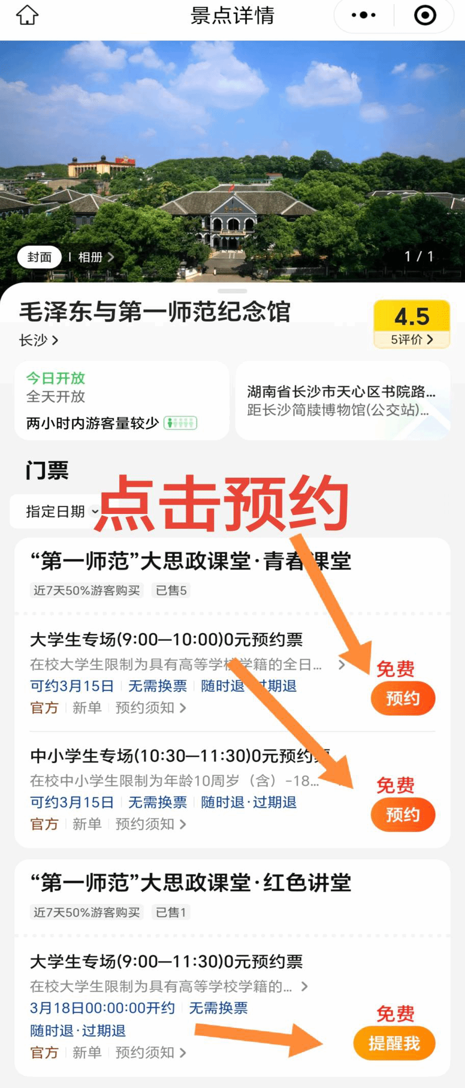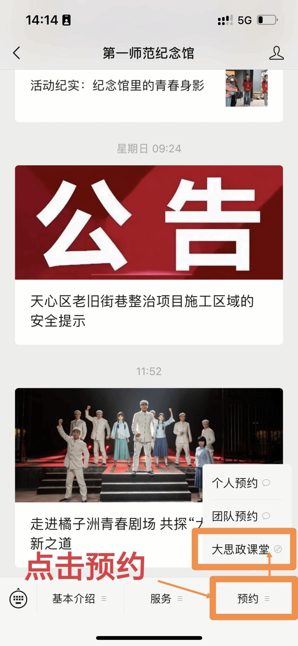 通过微信搜索公众号“第一师范纪念馆”,点击底部菜单“预约”中的“大思政课堂”进入预约界面。