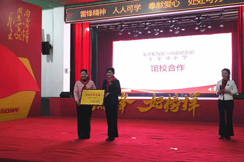 在毛泽东等老一辈革命家为雷锋同志题词60周年之际,3月2日,毛泽东与第一师范纪念馆和长沙市王家冲小学联手共建,在第一师范旧址大礼堂举行了“循伟人足迹·传雷锋精神”主题活动暨馆校德育共建授牌仪式。