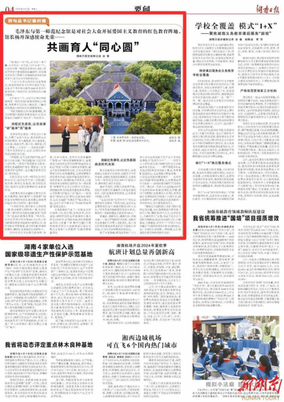 “在我们学校,每年新生入学的第一周、新进教师入职的第一周,毛泽东与第一师范纪念馆都是他们接受‘馆课一体’沉浸式教育的课堂。”杨丹说,毛泽东等伟大校友和280余位烈士校友的革命事迹启迪着师生们的心灵,筑牢他们的思想根基,成为师生们厚植家国情怀、赓续红色血脉的生动教科书。