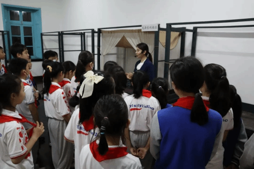 随后纪念馆副馆长张颖老师为孩子们进行了讲解技能的培训,宣教科邹磊老师则带领孩子们在纪念馆里的八班寝室、古井等地点进行了现场示范讲解。